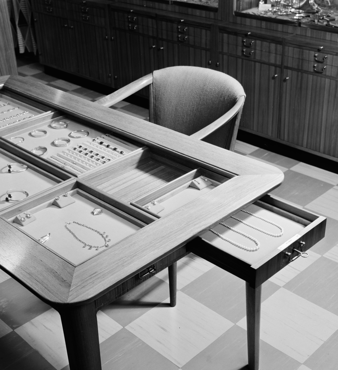 Butiksinteriör, detalj av bord med smycken i nedsänkta fack under glassiva.