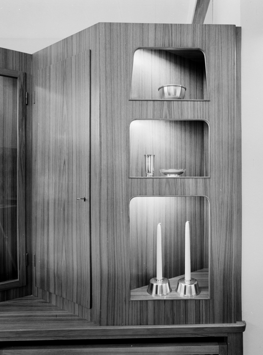 Butiksinteriör, ljusstakar och andra föremål i trämonter