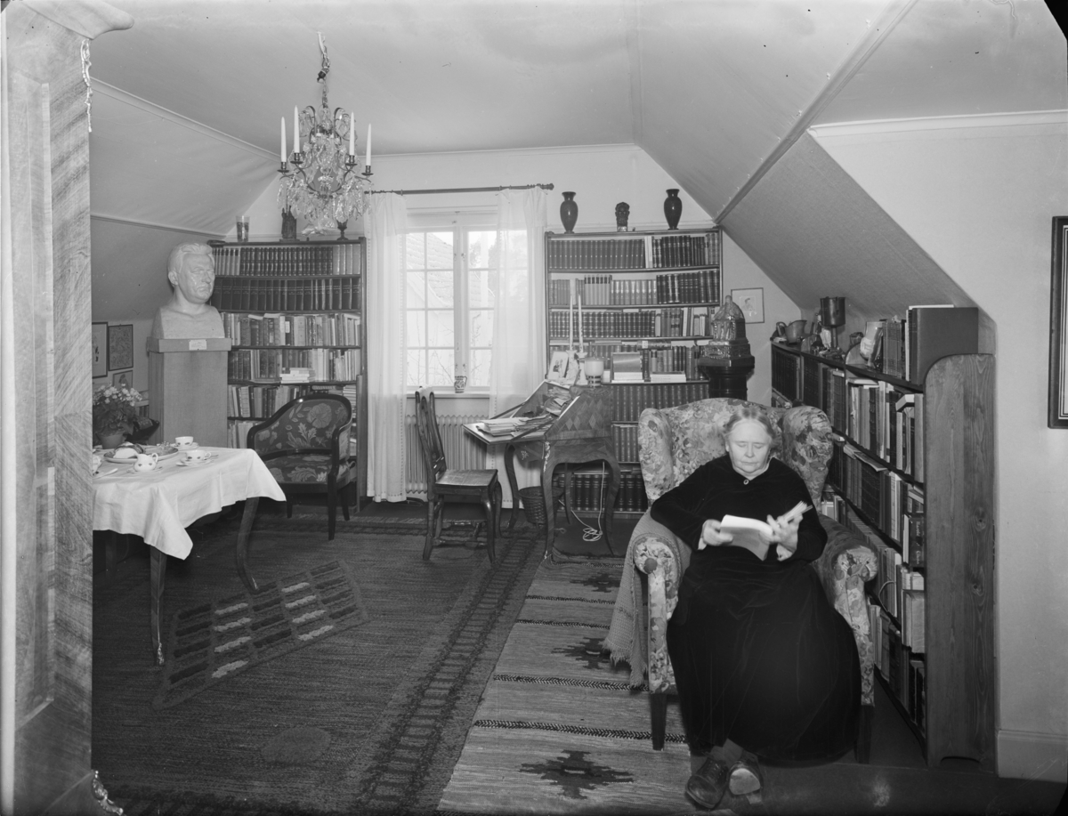 Maria "Maja" Månsson (född Qvist) i sitt hem. Maja var änka efter politikern och författaren Fabian Månsson.