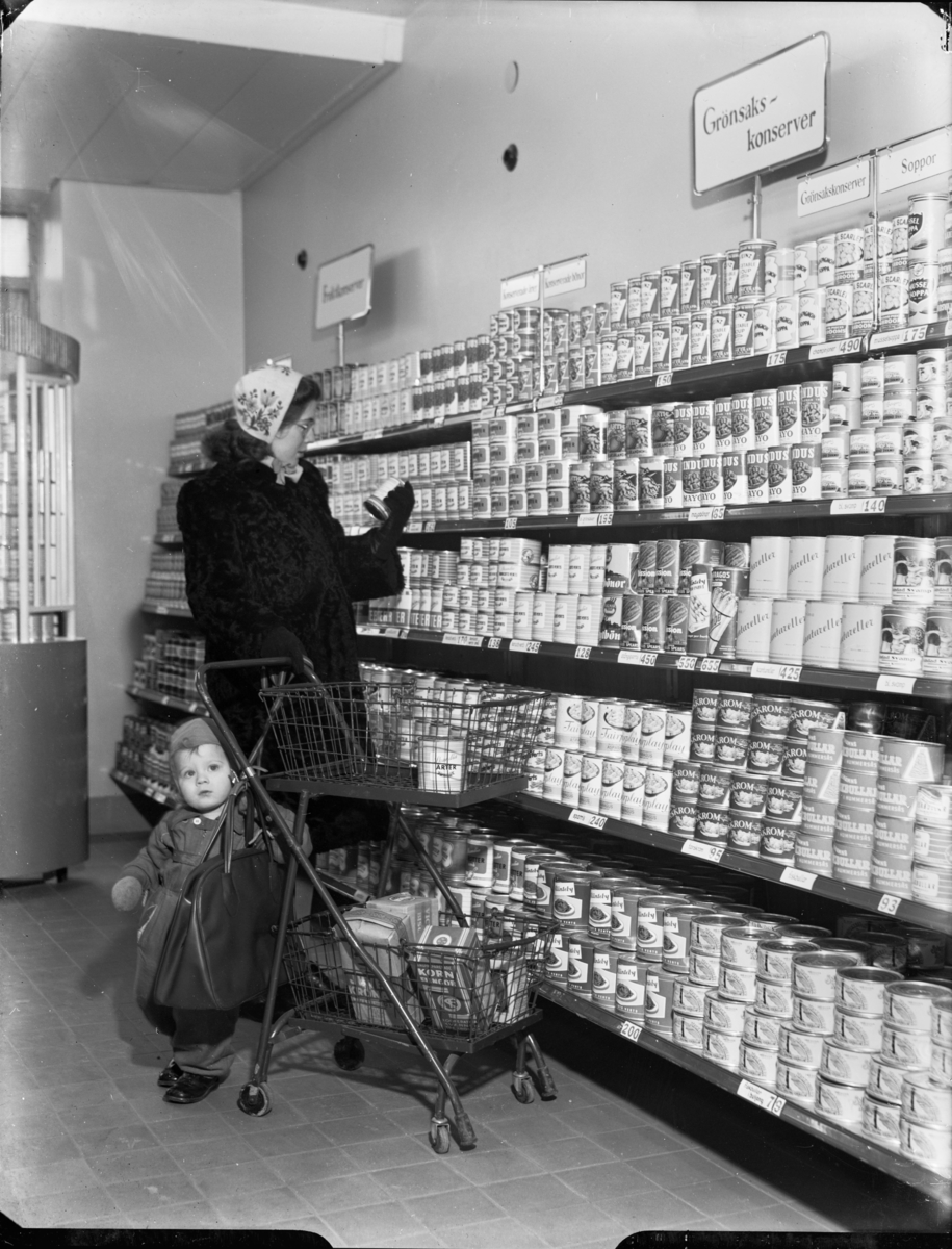 Titel: Konsum snabbköp Kvinna och barn "Husmor handlar i Konsum snabbköp" Interiör