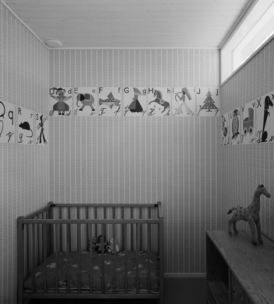 Interiör, barnkammare med alfabetsillustrationer på väggarna