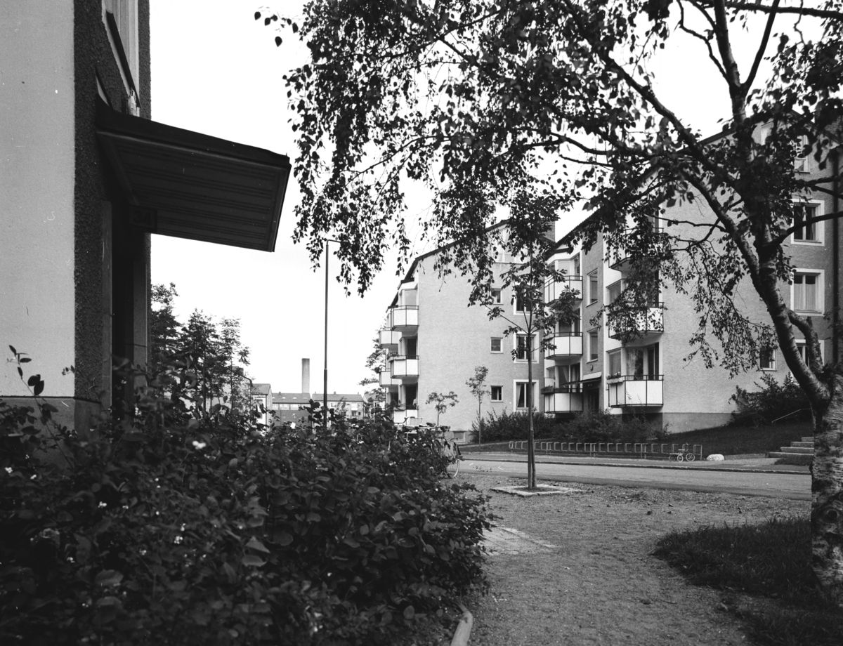 Exteriör, bostadsområde. I förgrunden lövträd samt detalj av entréfasad med skärmtak.