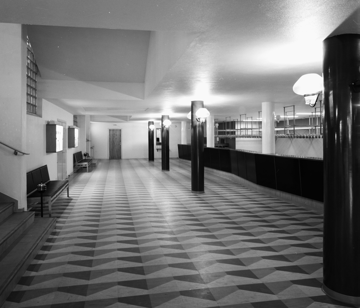 Interiör av stora foyern med lampförsedda pelare