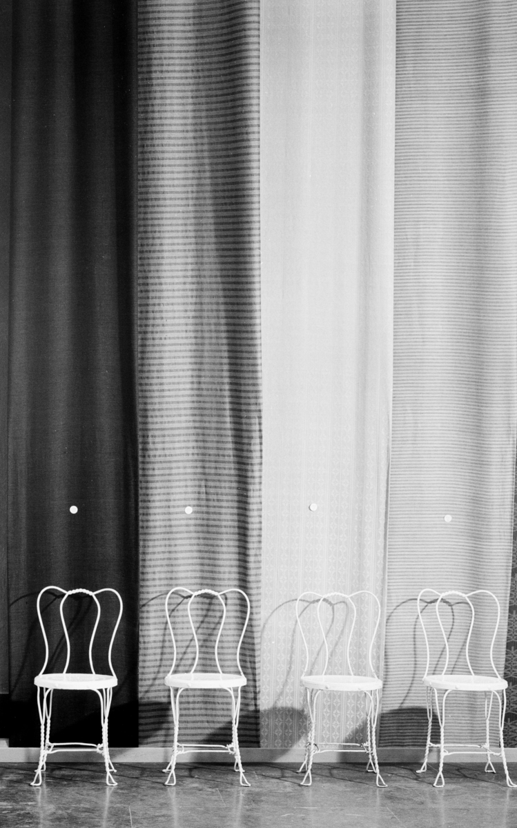 Stolar framför hängande tygstycken