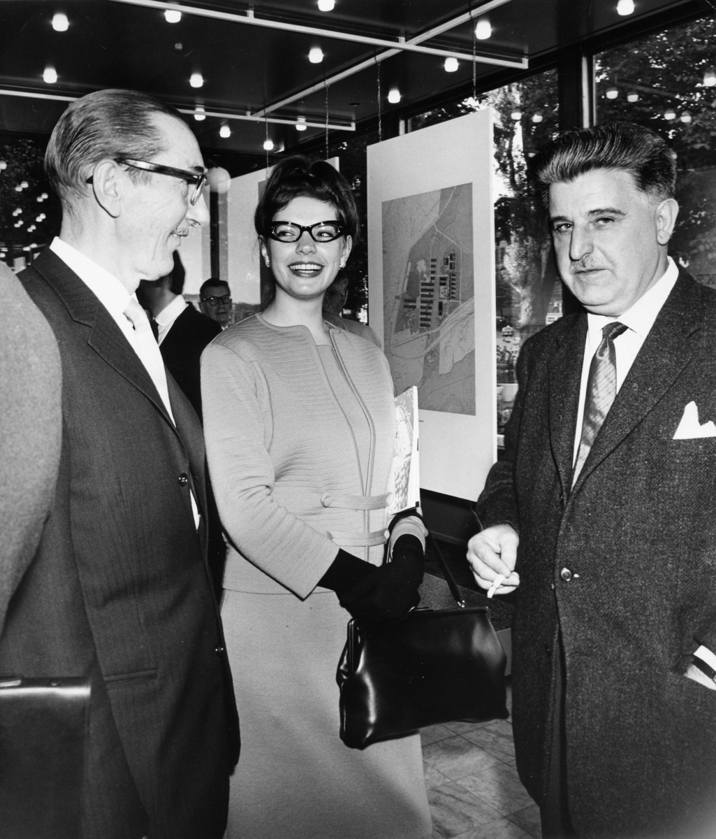Olle Bærtling i kostym, tillsammans med en kvinna och en man, troligen vid en utställning.