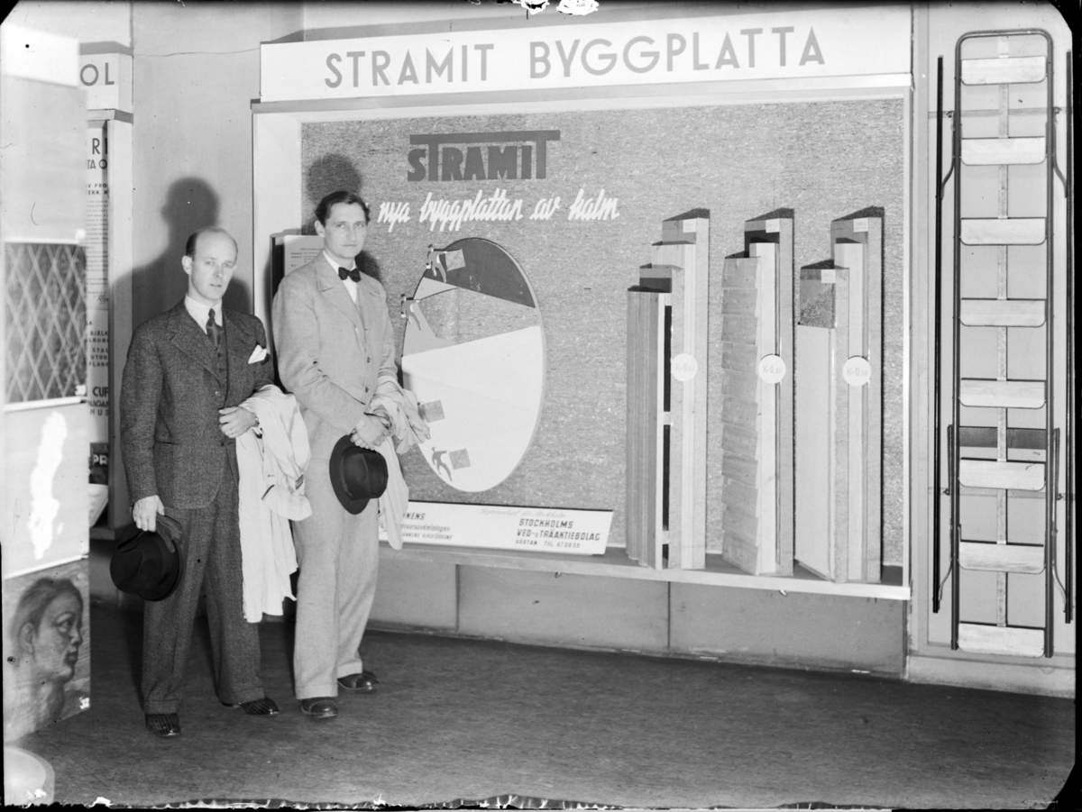 Två män vid en presentation av "Stramit - nya byggplattan av halm".