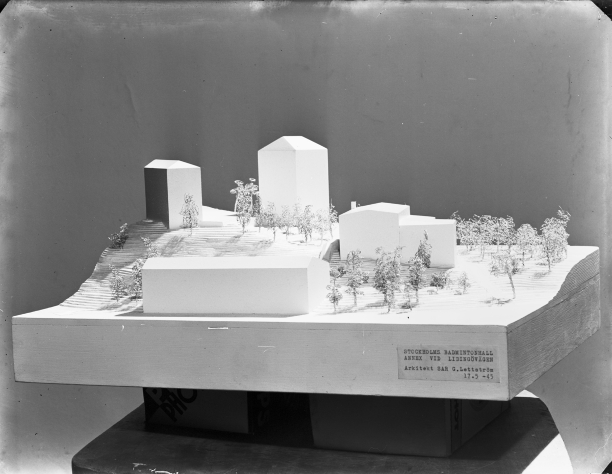 Titel: Modell av Stockholms badmintonhall Annex vid Lidingövägen
