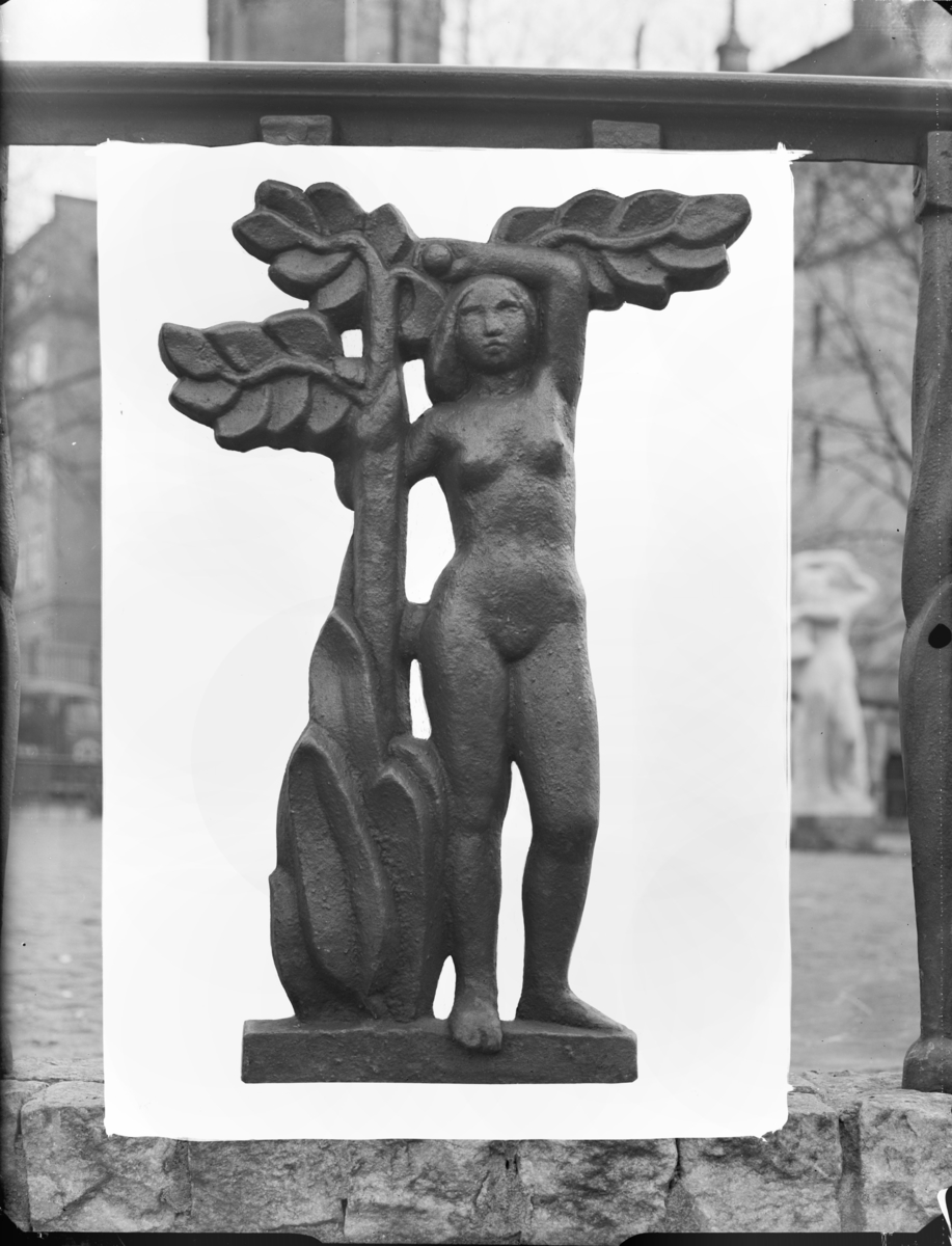 Skulptur föreställande kvinna och träd i staketet på Mosebacke torg