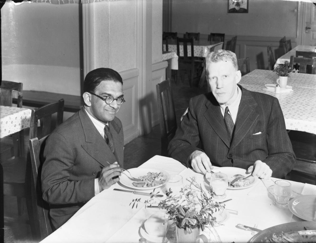 Mister G de Soyga och ytterligare en man äter mat på restaurang