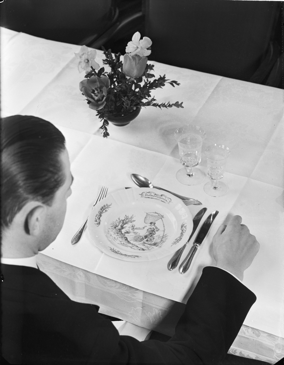 Man sittande vid bord uppdukat med glas, porslin och bestick