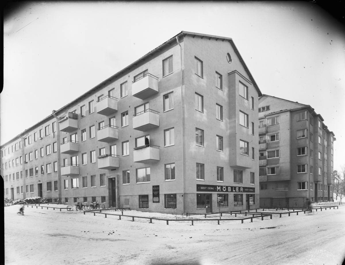 Titel: Flerbostadshus med butik i gatuplan Exteriör