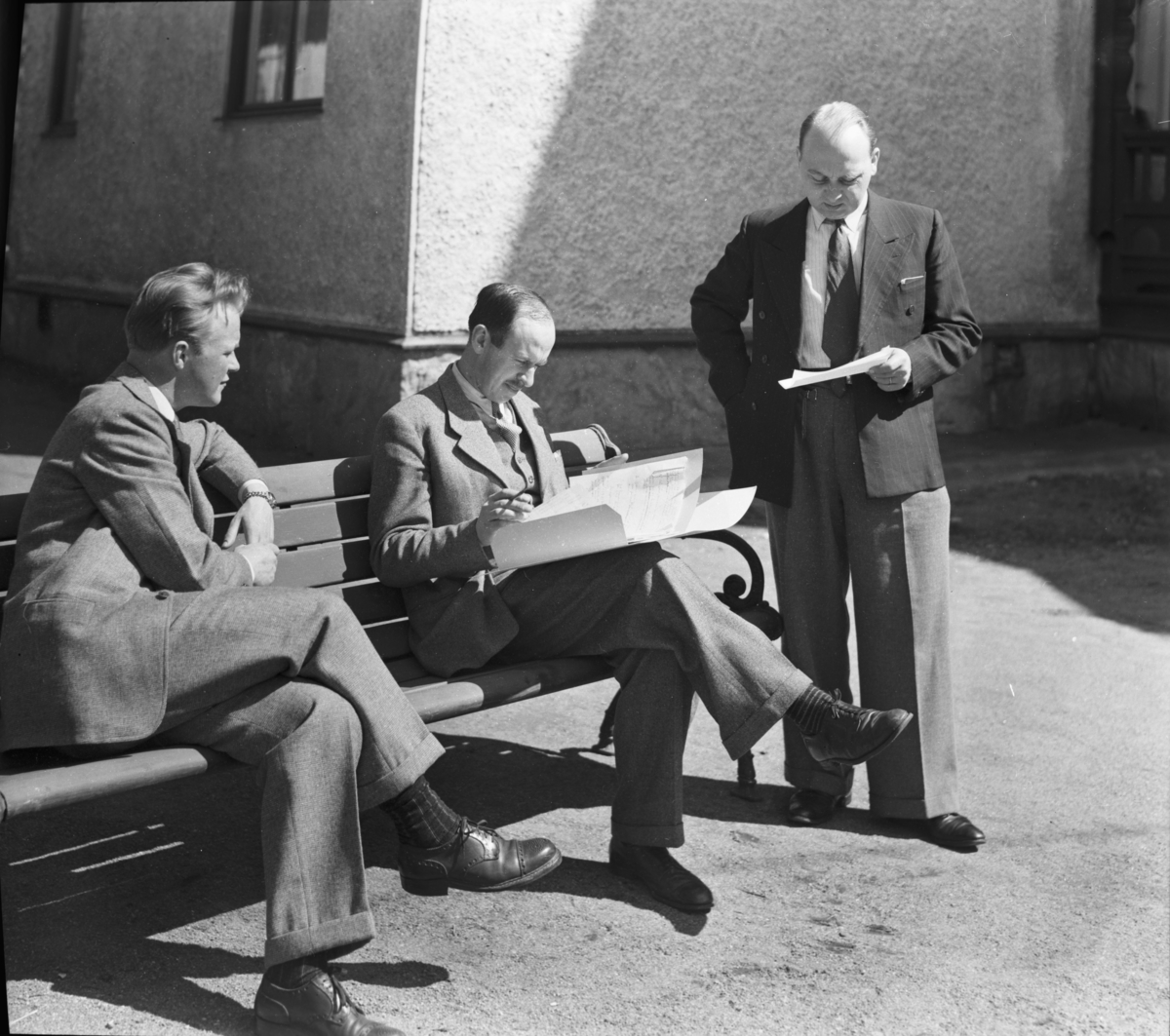 Tre män kring en bänk