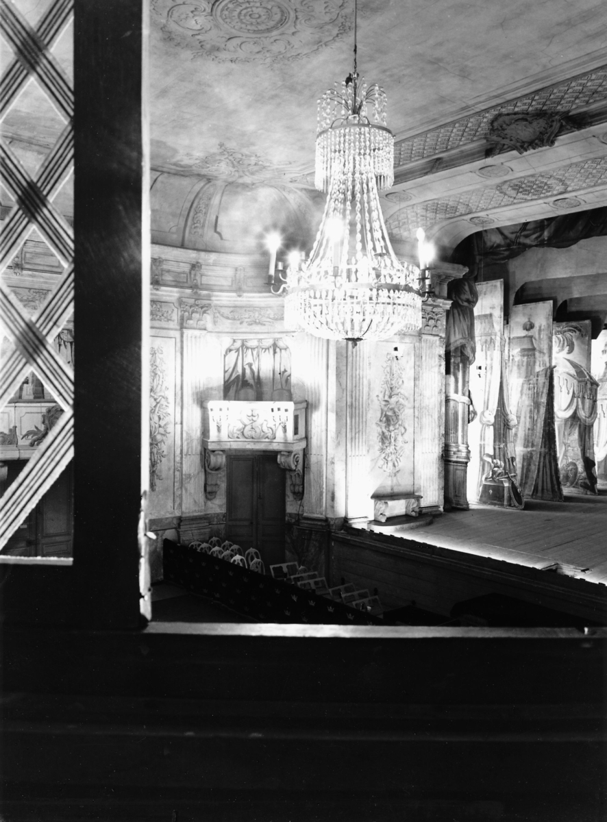Interiör. Del av scen samt de främsta bänkraderna. Kristallkrona.