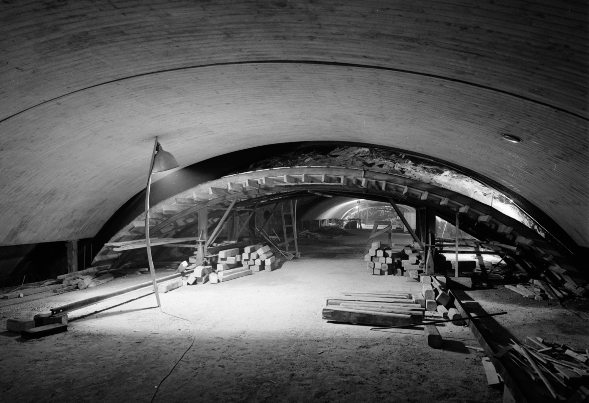 Interiör av garage, byggarbetsplats med form för valv