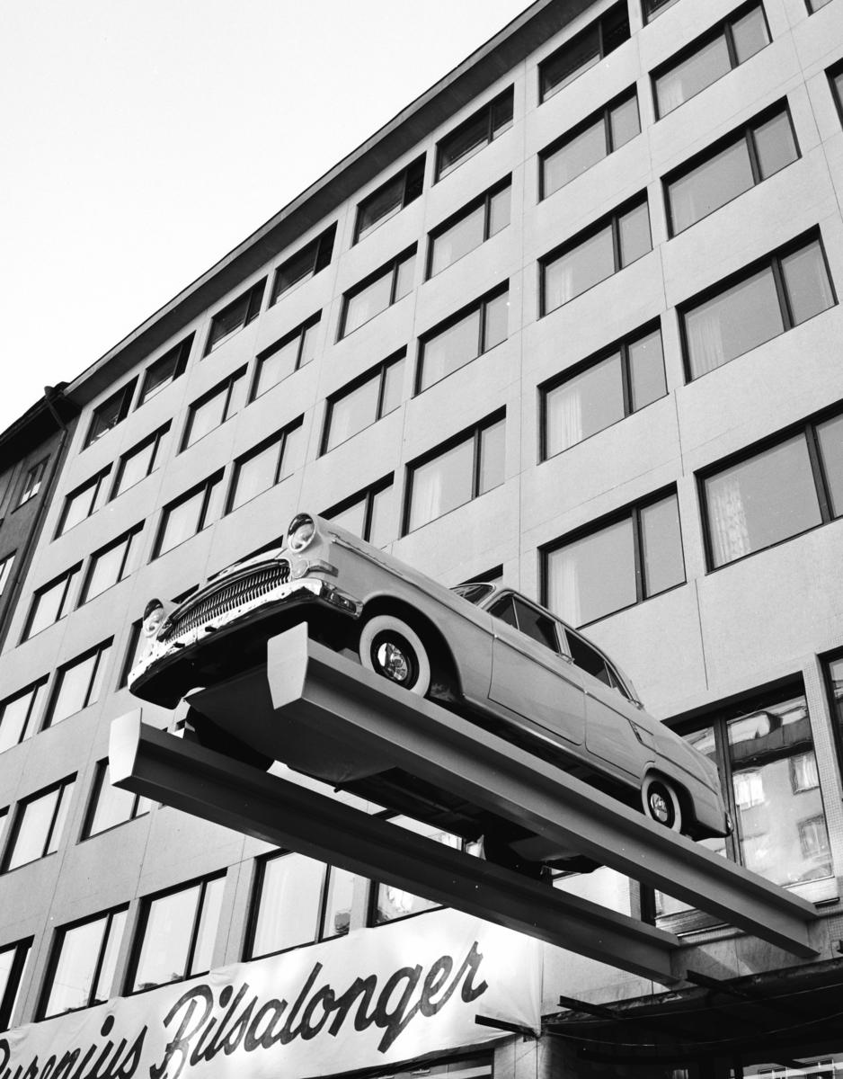 Exteriör, detalj av fasad med bilmodell på utskjutande konstruktion ovanför ingången