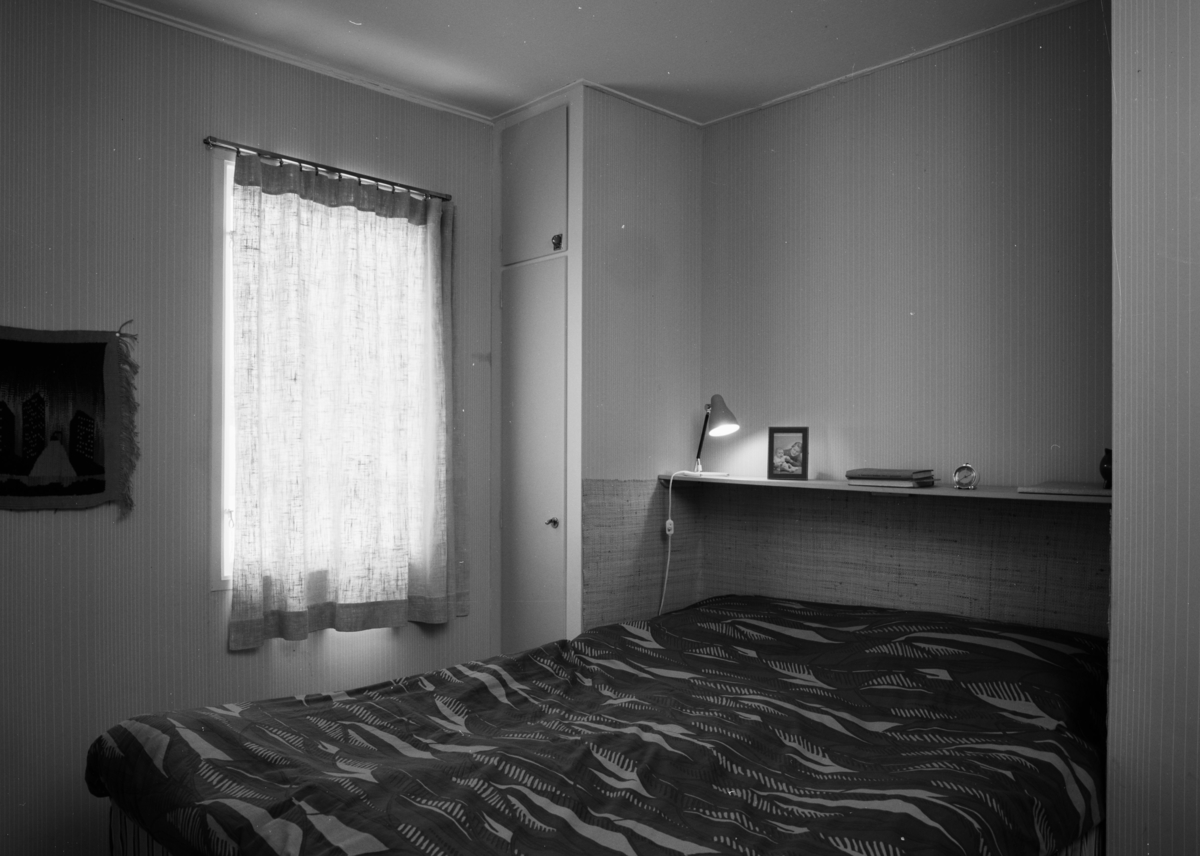 Interiör, sovrum, ljusinsläpp från fönster med gardin.