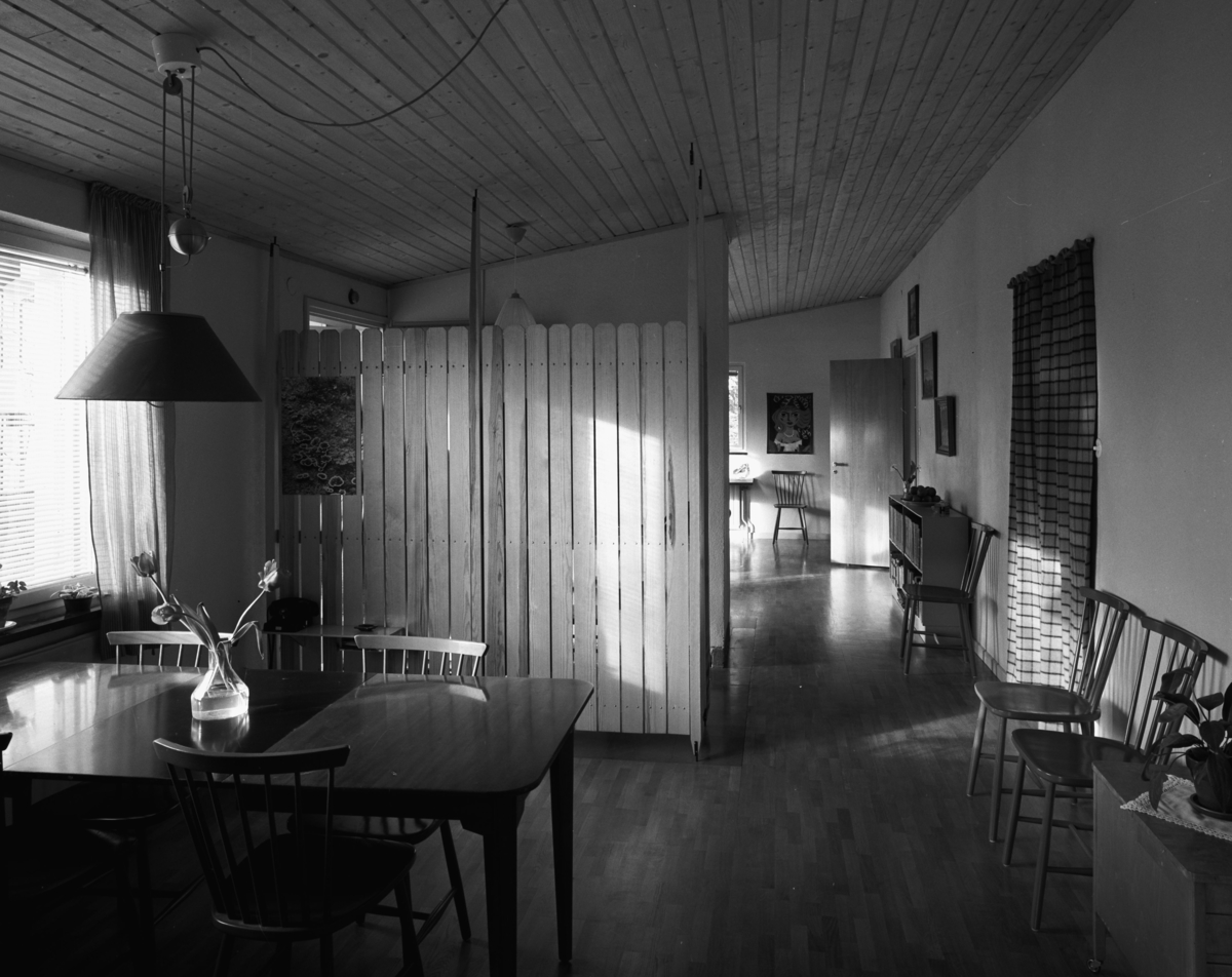 Interiör, vardagsrum med skärmvägg, matbord i förgrunden. Solljus genom fönstret.