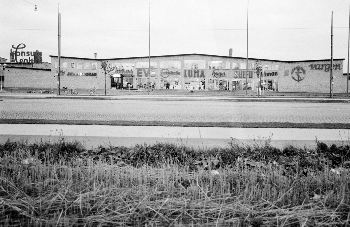 Exteriör, centrallager med bageri och specialutställning, motorväg och gräs i förgrunden.