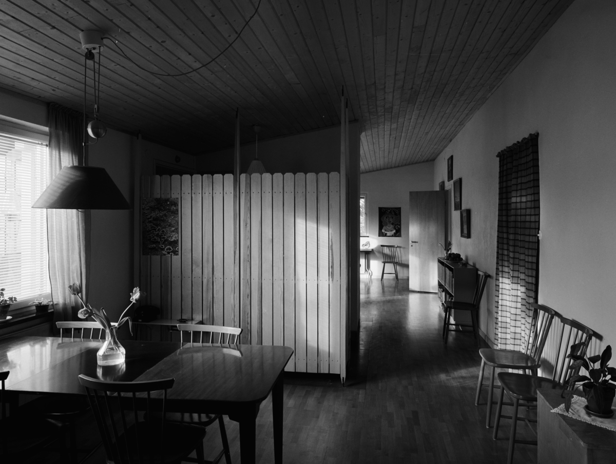 Interiör av vardagsrum. Skärmvägg som rumsavdelare och matbord i förgrunden