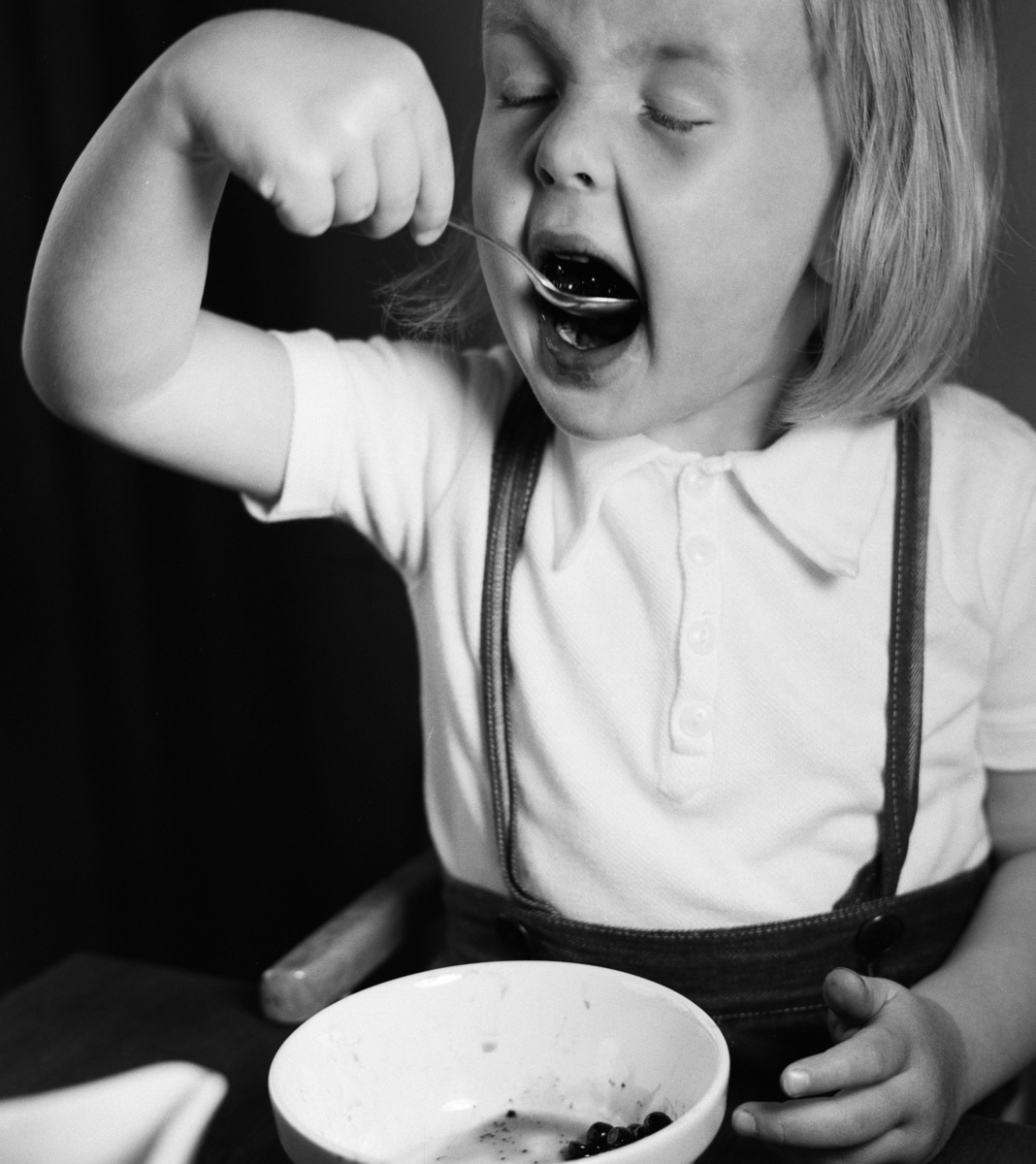 Flicka äter bär med sked. C.-H. Stålhanes servis från Rörstrand och Servus bestick av Sigurd Persson från Kooperativa Förbundet