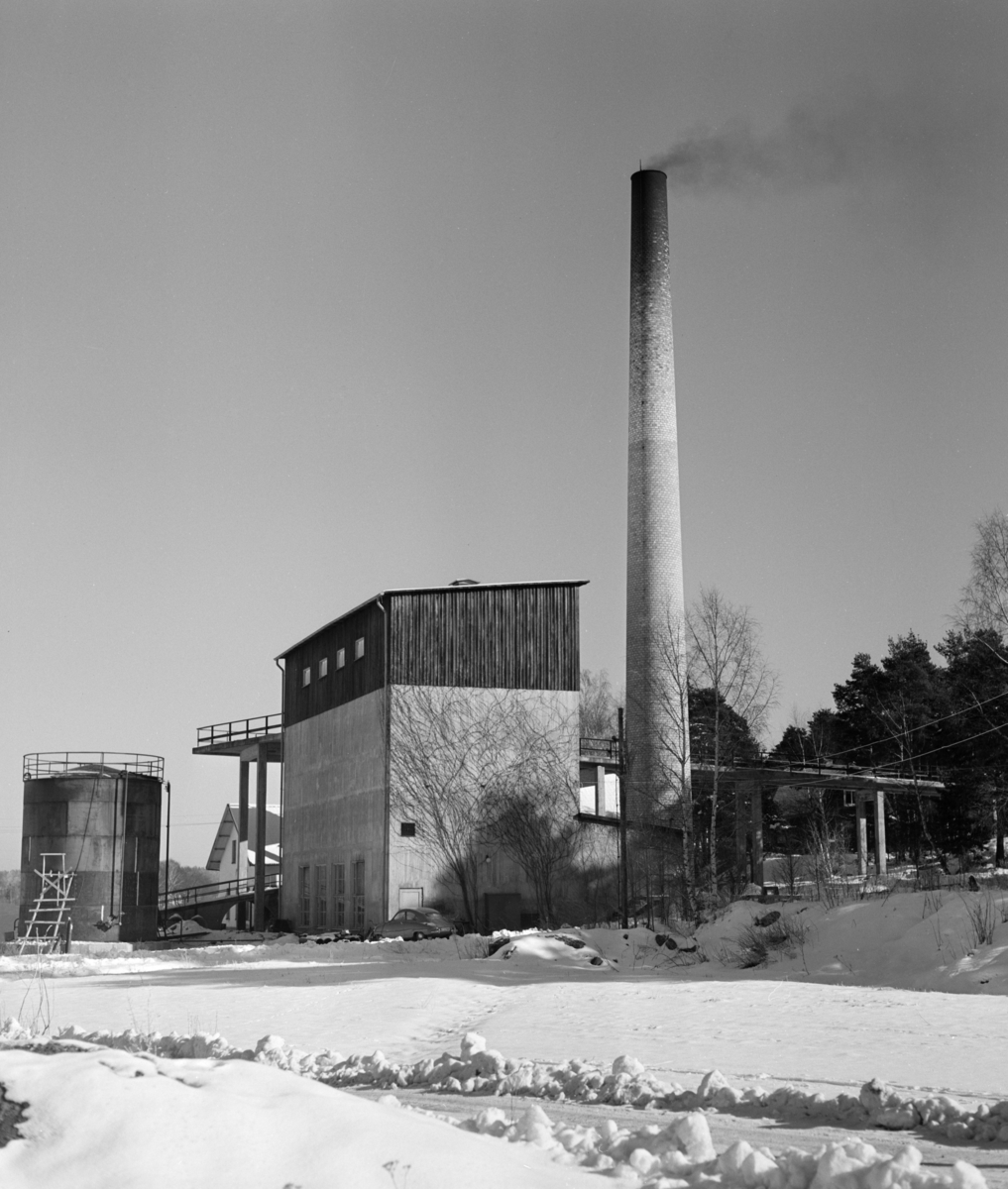Exteriör, ångcentral med rök mot himlen i vinterlandskap.