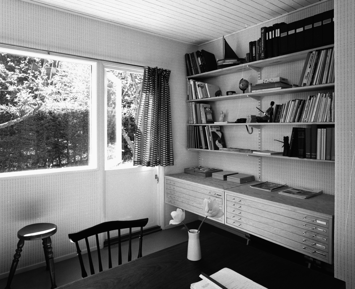 Interiör, arbetsrum med bokhyllor och ritskåp upphängda på Sparringkonsoler