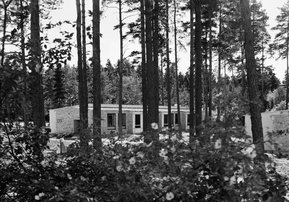 Exteriör, byggnad bakom höga trädstammar
