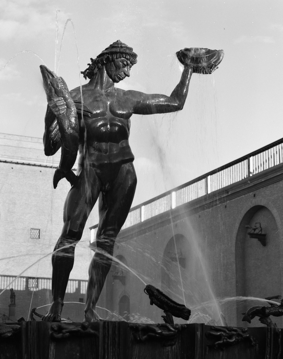 Exteriör. Detalj av fontänen Poseidon med Göteborgs konstmuseum i bakgrunden