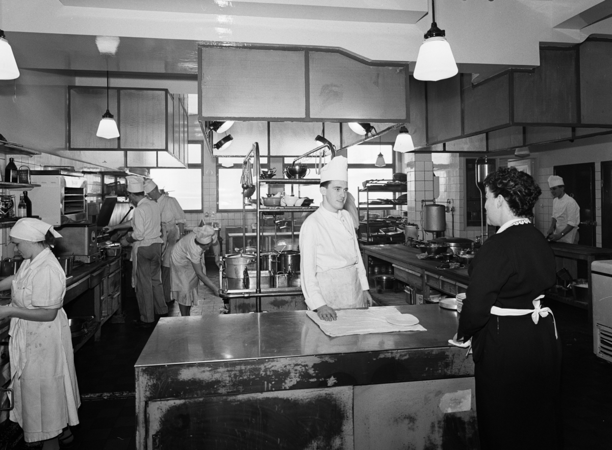 Interiör av restaurangkök med kökspersonal. Servitris i förgrunden.