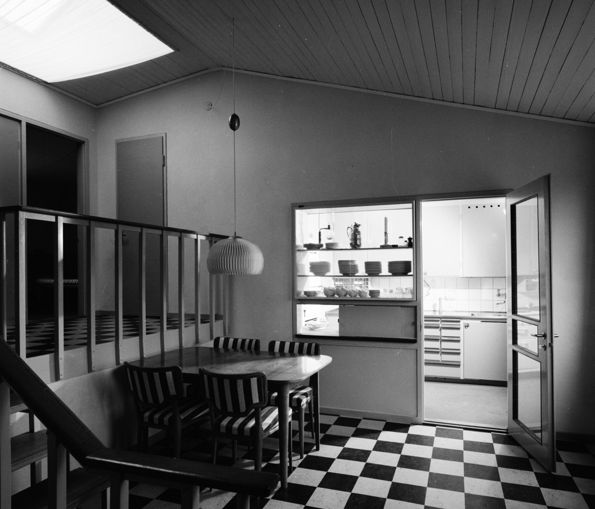 Interiör hos arkitekt Stäck, allrum i två nivåer med schackrutigt linoleumgolv och takfönster. Matbord framför upplyst kök bakom genomräckningsskåp med glasluckor