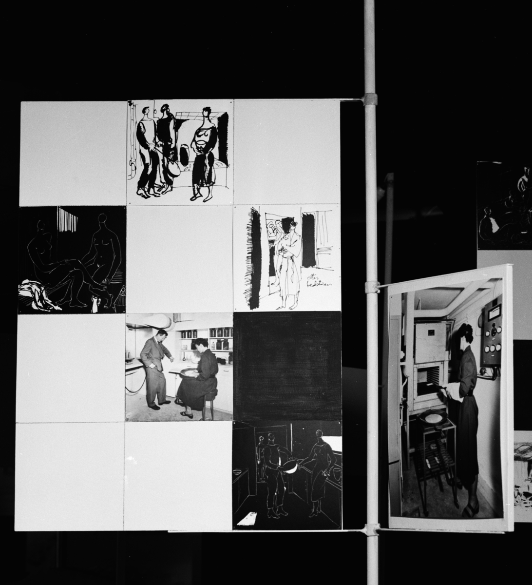 Interiör, arkitekt Korsmos utställning, Skansen. Utställda teckningar på skärmvägg.