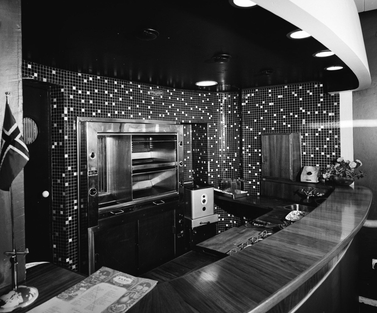 Interiör, bar med mosaikvägg samt välvd disk med likaledes välvt utskjutande tak.