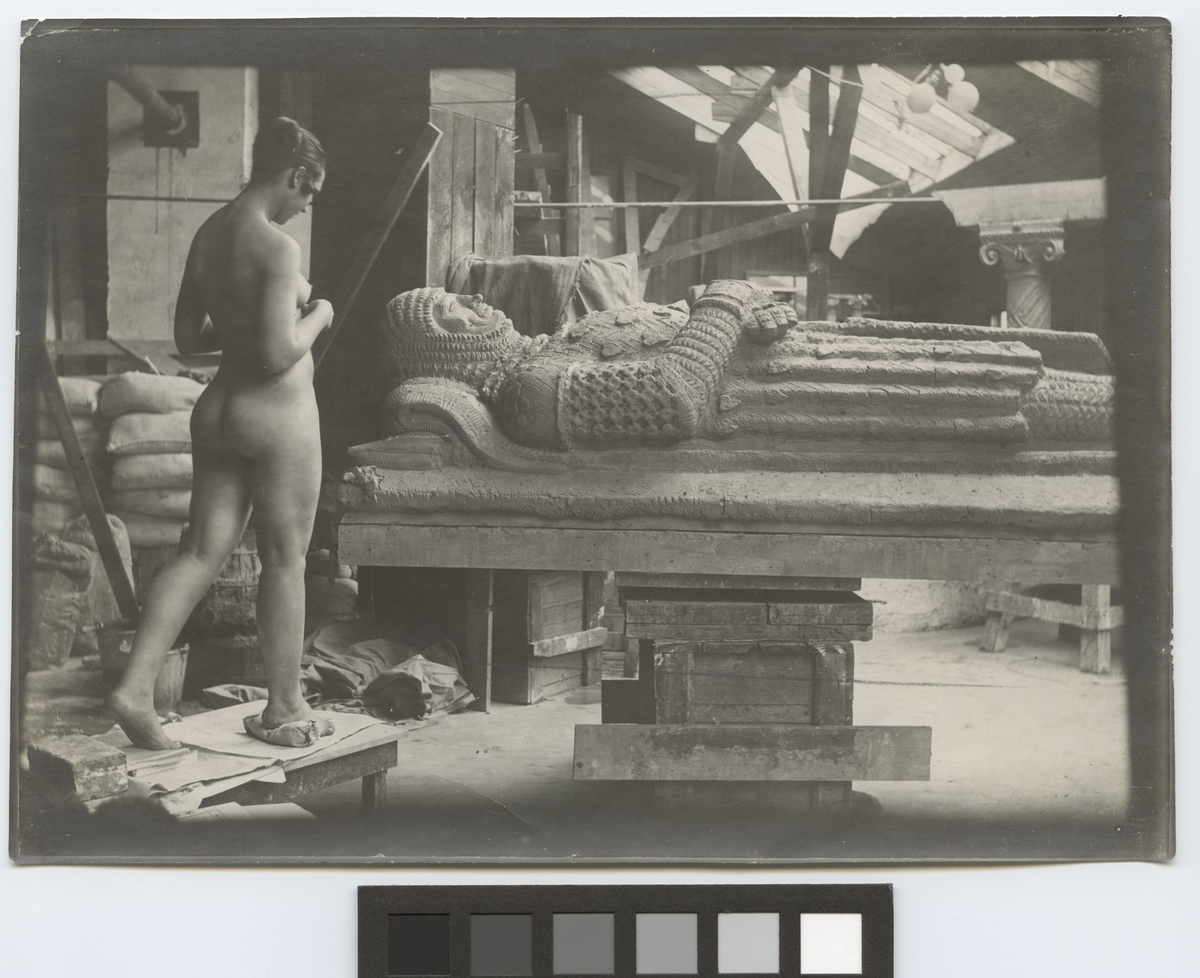 Modellverkstad på vind med en del av Birger Jarls monument samt kvinnlig modell.
