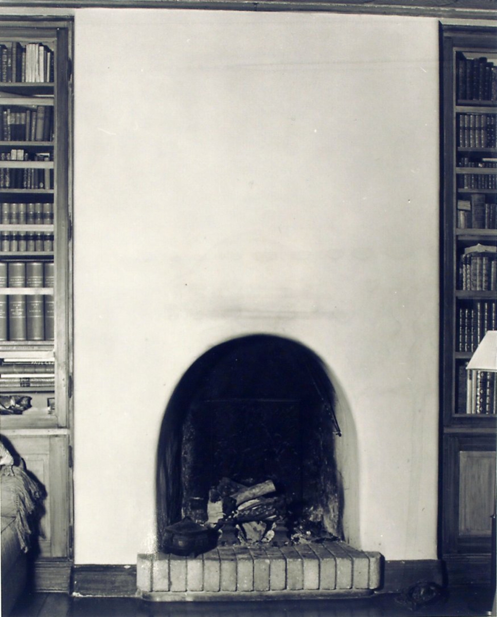 Interiör, detalj av den öppna spisen i biblioteket (före detta salongen).