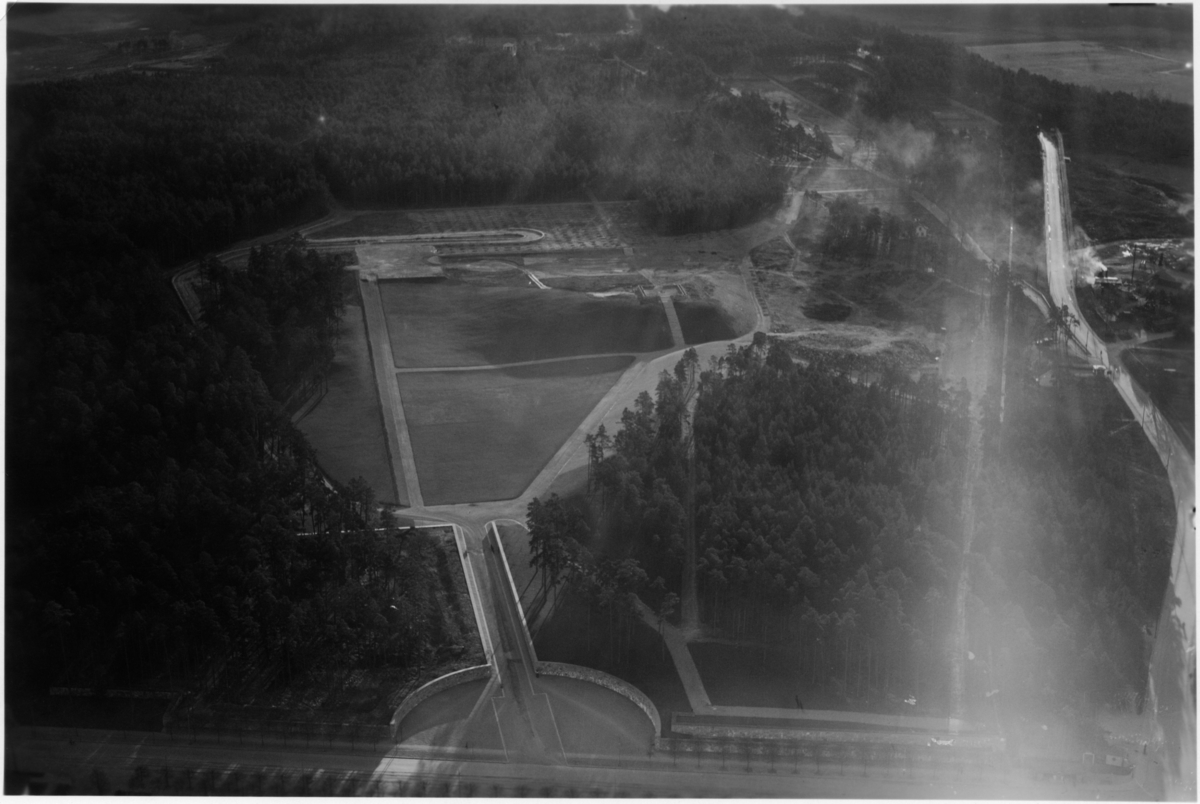 Flygfoto, av huvudentren med minneslunden, under uppförande. Vy söderut