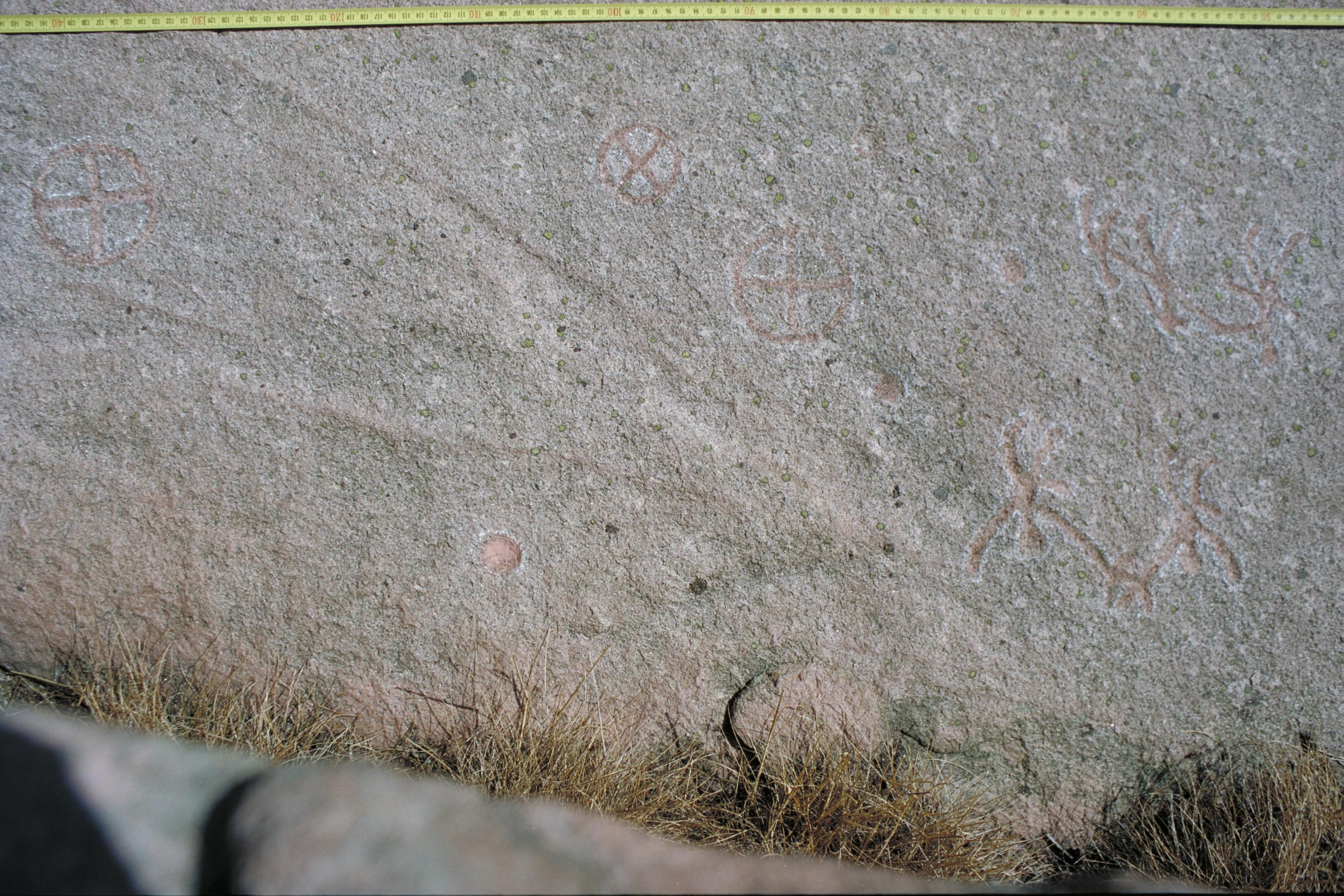 Vittrad hällyta med solkors m.m. Tossene 73:1.