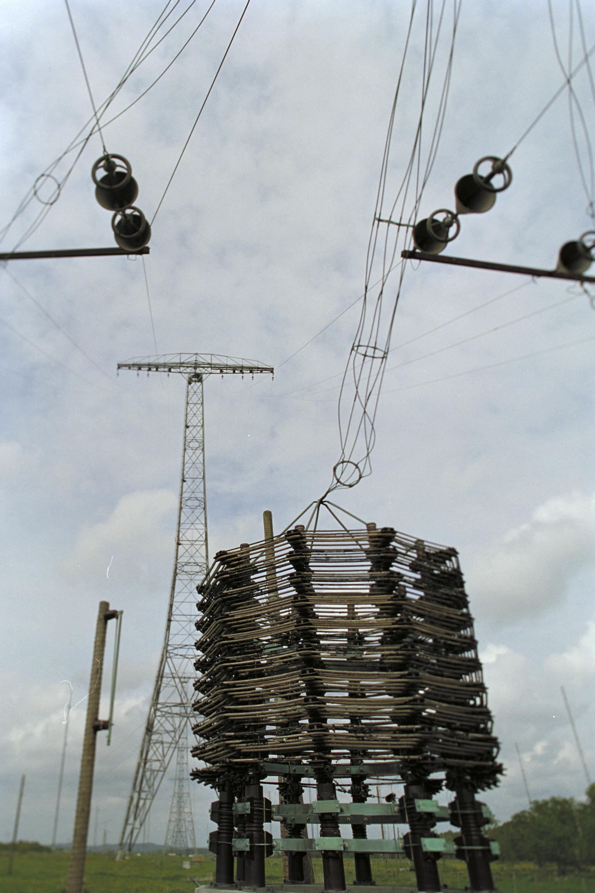 Anpassningsspole med matarledning. I bakgrunden 127 m hög antennbärarmast.