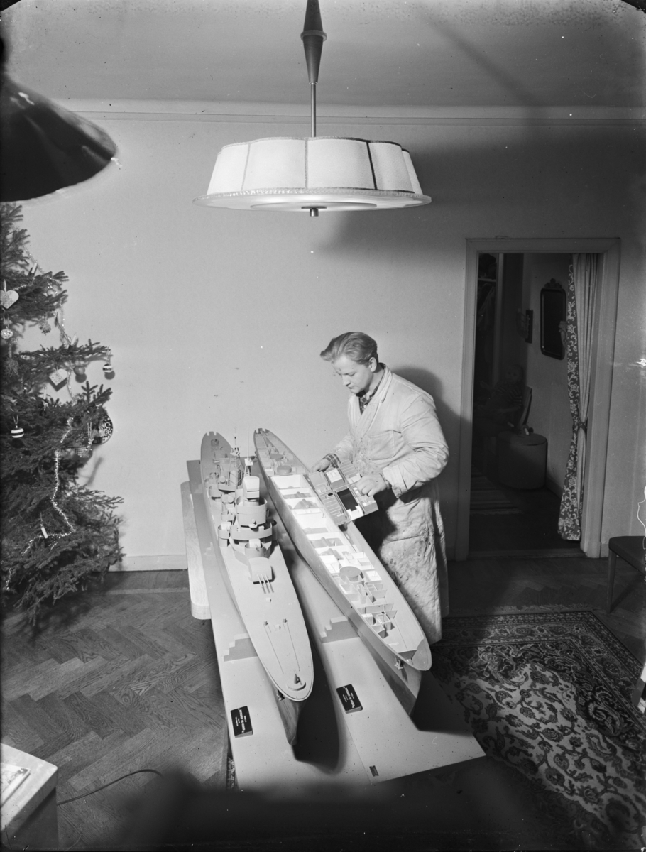 I hemmiljö med modellbyggare, julgran och i hallen ett barn