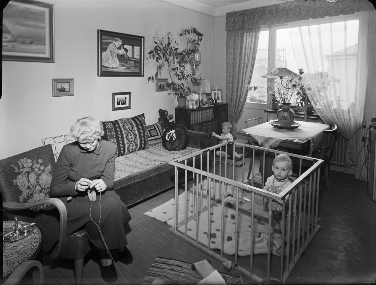 Vardagsrum med en kvinna, ett barn och en barnhage