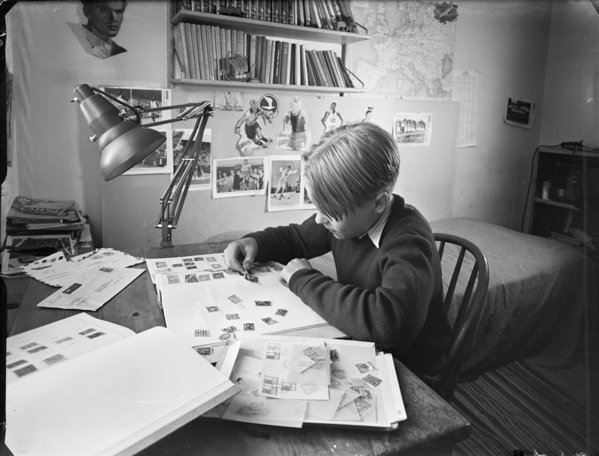 Pojkrum med en pojke som ordnar med sin frimärkssamling