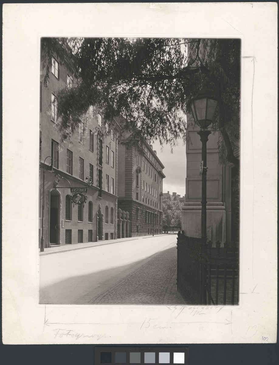 Exteriör. Vy från Wahrendorffsgatan mot Stockholms Enskilda Bank och omkringliggande byggnader.
