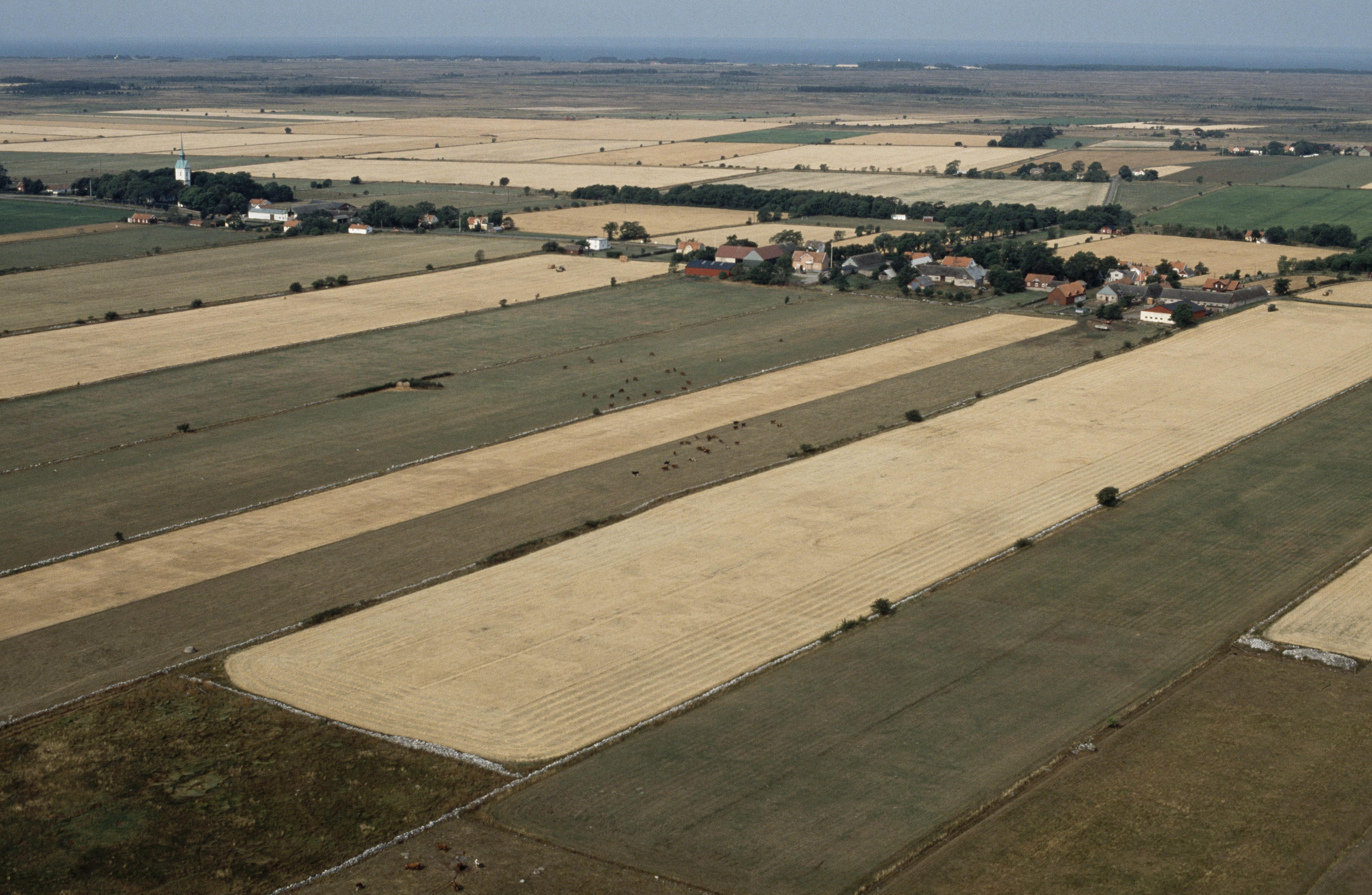 Alvaret, södra delen. Gräsgårds kyrka och kyrkby i bildens övre del till vänster. Bilden är tagen mot (väderstreck): SV