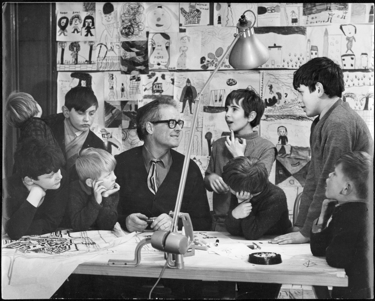 Ralph Erskine tillsammans med barn vid ritbordet.