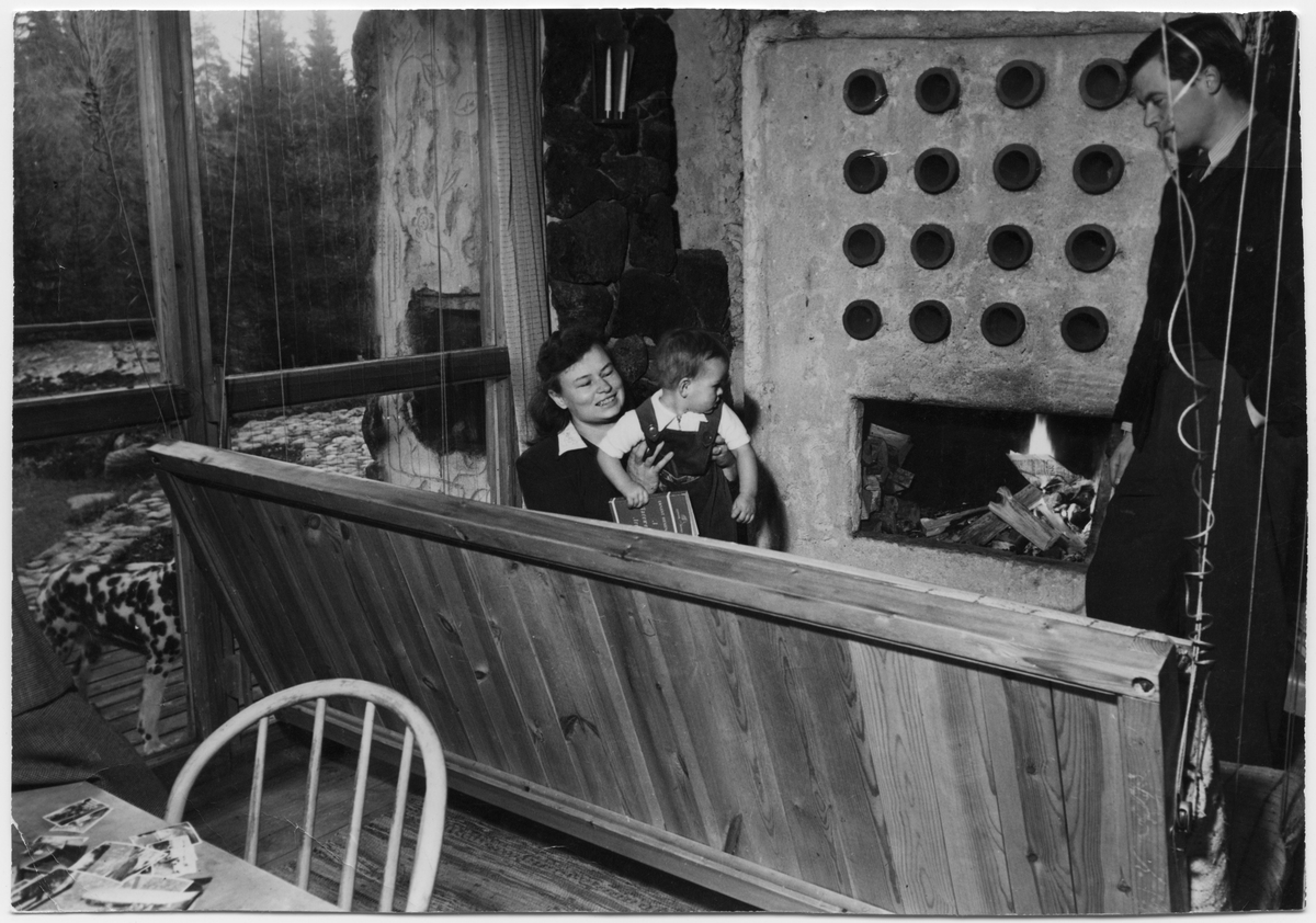 Interiör. Paret Erskine med ett barn vid öppen spis.