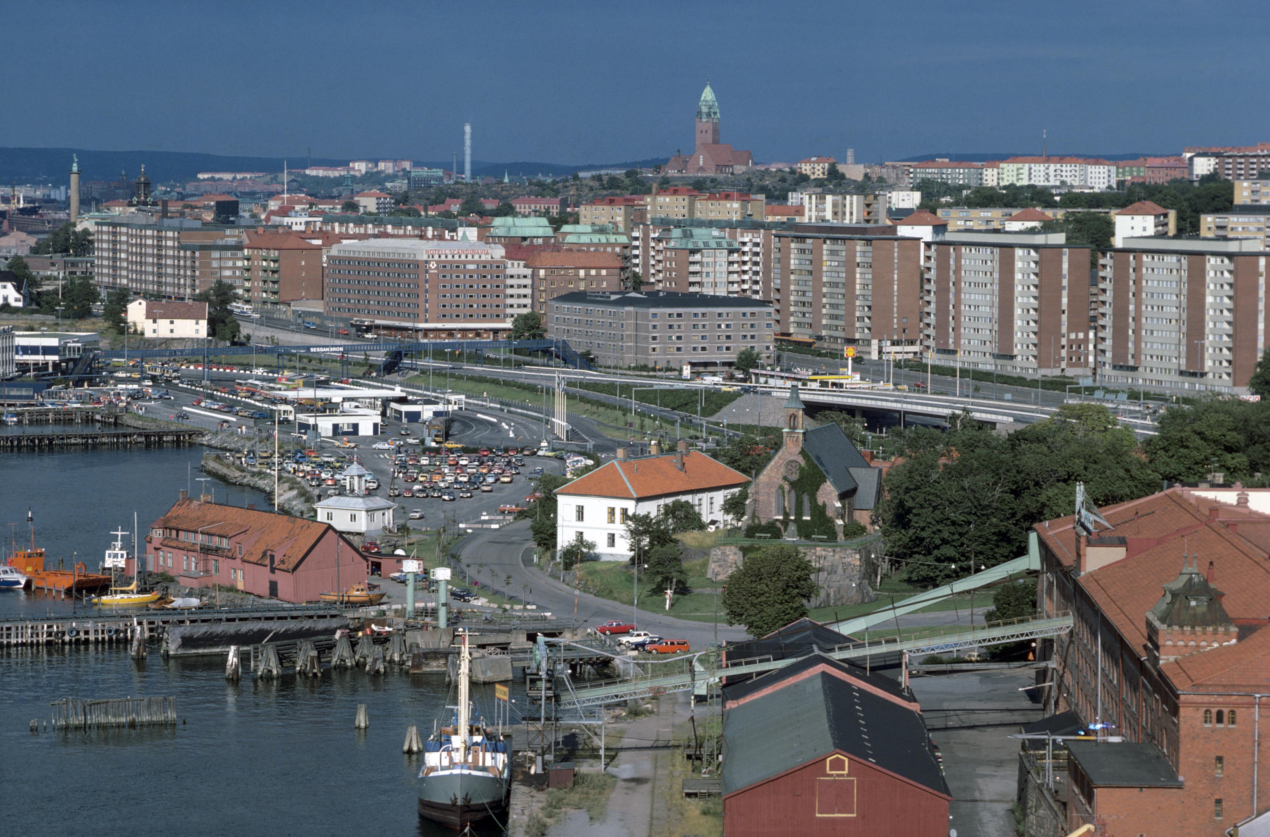 Bild tagen från Älvborgsbron över stadsdelen Klippan, mot centrala Göteborg. I förgrunden syns Sankta Birgittas kapell (t.h. om den vita byggnaden) och i bakgrunden Masthuggskyrkan.