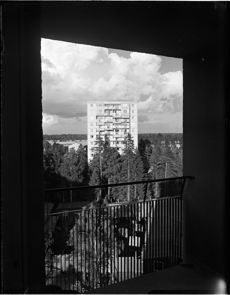 Titel: Höghus från baracktak, höghus från hög ståndpunkt i Kärrtorp