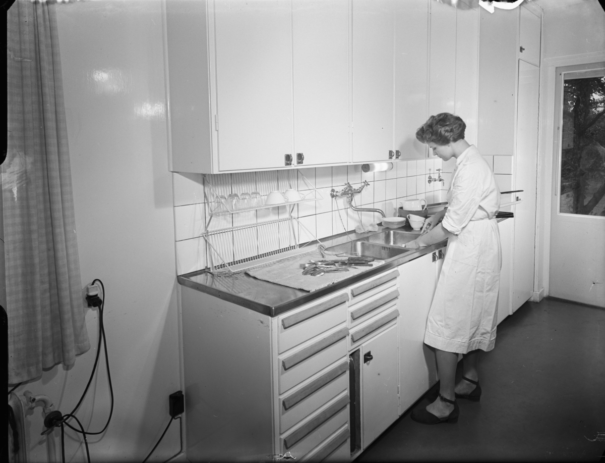 Diskning i två olika kök, gammalt och modernt för dansk utställning