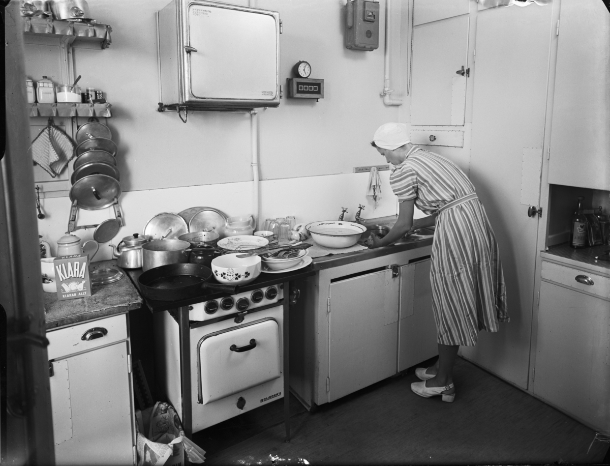 Diskning i två olika kök, gammalt och modernt för dansk utställning