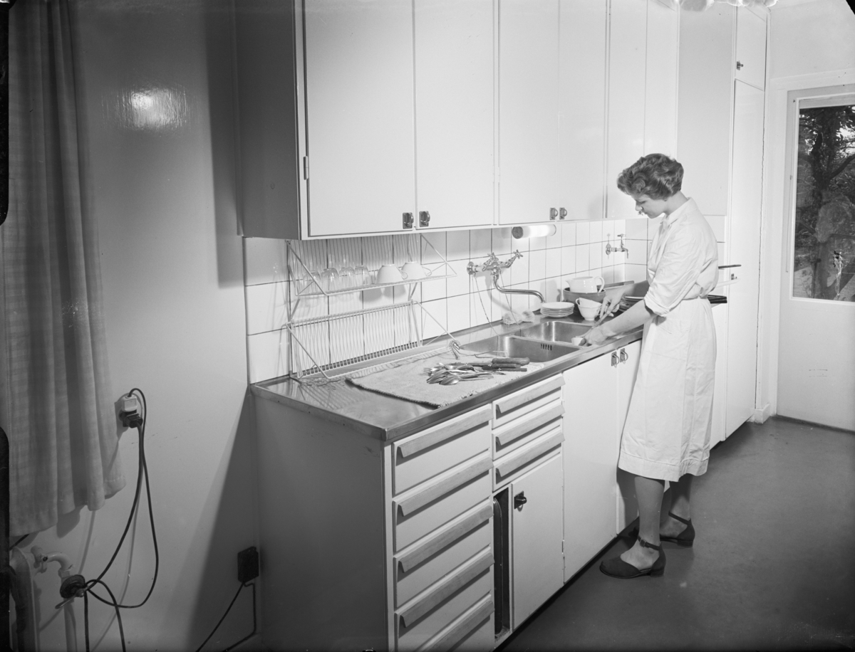 Diskning i två olika kök, gammalt och modernt för dansk utställning