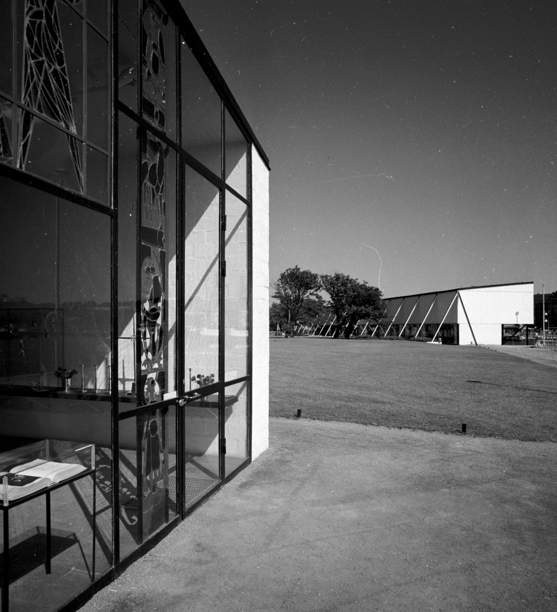 Exteriör, avdelningen för kyrklig konst, dekorerad glasfasad.